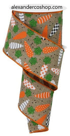 Get in the spirit of Easter when you decorate with this patterned carrots on royal ribbon! This ribbon has a wired edge, and features an array of colorful carrots, with striped, polka dot and checkered patterns, against a light beige base! Use this ribbon in an Easter-themed wreath display, complete with themed sprays and picks, and colorful mesh!