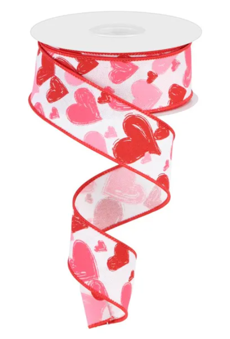 1.5" x 10yd Hand Drawn Hearts/Gauze Wired Ribbon