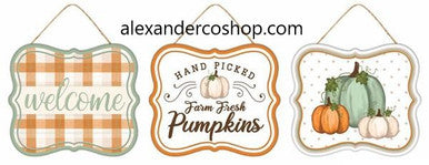 Set of 3 Assorted 7"LX6"H TIN MATTE FALL SIGNS CREAM/ORANGE/SAGE