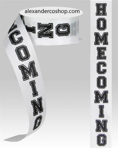 1.5"X100 FT Homecoming on Satin White Back Ground with Silver Lettering