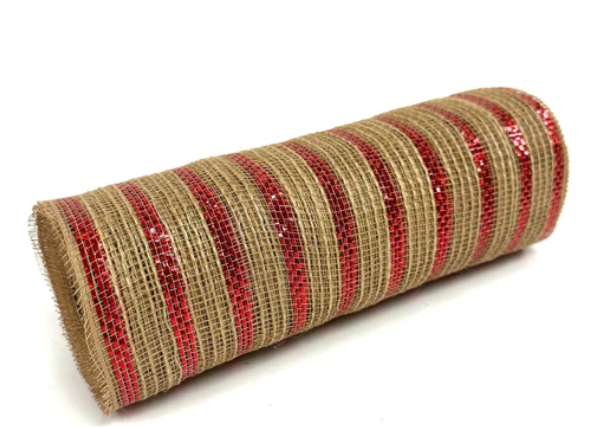 10" x 10 yd Burlap with Red Metallic Stripe Mesh