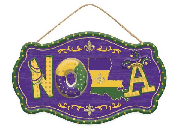 Celebrate New Orleans for all your favorite reasons with this stylish NOLA frame sign! This sign includes a different element of city culture in each letter including beads, a king cake, the fleur de lis, and a jester hat! Use this sign as the centerpiece of a wreath display to show your New Orleans pride for all to see!