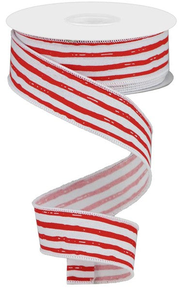 Add this versatile irregular stripes on royal burlap ribbon to any display you see fit! This ribbon features a sewn wired edge and an eye-catching white and red stripe pattern, making it an adaptable addition to any decorative piece of your choosing.