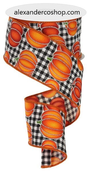 Outfit your Fall display with this stitch pumpkin/gingham ribbon to set it over the top! This diagonal weave ribbon includes a sewn wired edge, with a collection of charming stitched pumpkins atop an ivory and black check base! Add this ribbon to a wreath, outfitted with other Fall enhancements, like sprays, picks or pumpkins!