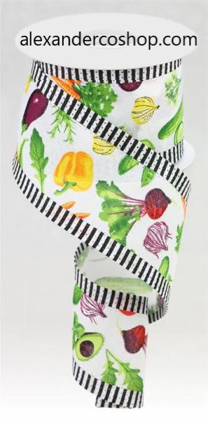 Satisfy your hunger for creative decorating when you use this vegetables/stripes ribbon! This faux royal burlap ribbon features a folded fabric wired edge and a white base, plus a mix of peppers, avocados, carrots, cucumbers, and more! This ribbon will be a perfect fit for a wreath display, complete with sprays and picks, or a sign to match the theme!