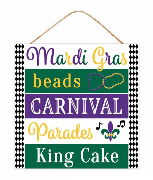 Hang this sign among your Mardi Gras decor to tie in the most fun elements of the holiday! Whether you look forward to the parades and carnivals, the delicious king cake, or wearing the beads, this sign will satisfy all of your needs! Use this sign in a wreath display, or as a standalone decoration; be sure to outfit it with some matching decor, like ribbon, sprays and picks, or even masks!