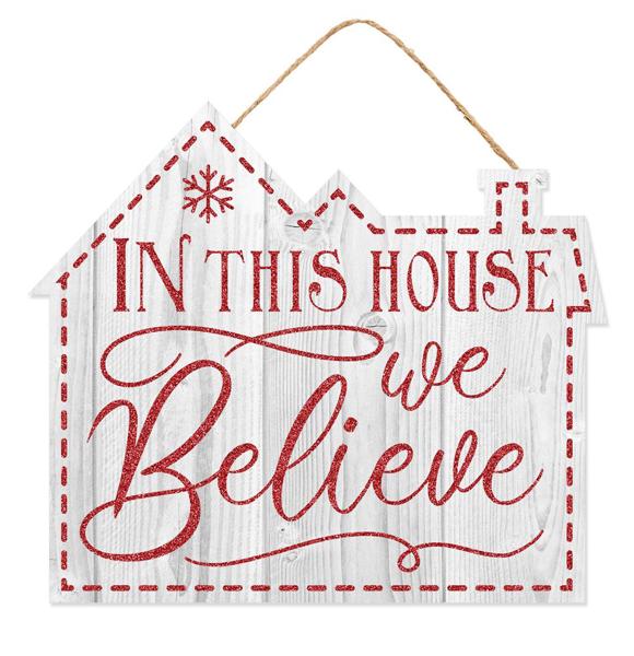 Show you still believe this holiday season with the help of this stylish sign! Featuring the outline of a house, with a wood-like background and glitter script, this sign will make the perfect addition to your holiday decor! Use this sign in a wreath display, outfitted with ornaments, Christmas sprays and picks! You can also hang this sign above the mantle to stand with the stockings.