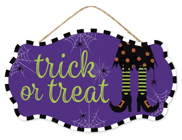 Your eyes aren't tricking you: this sign is one heck of a Halloween treat! Featuring an assortment of creepy spiders resting in their webs and the iconic sight of a witch's curled buckle shoes, this "Trick or treat" sign has a few stylish tricks up its sleeve! This sign can be displayed by the front door on Halloween night to welcome an array of costumed candy-seekers, or tied into a Halloween wreath display with some spooky ribbon!
