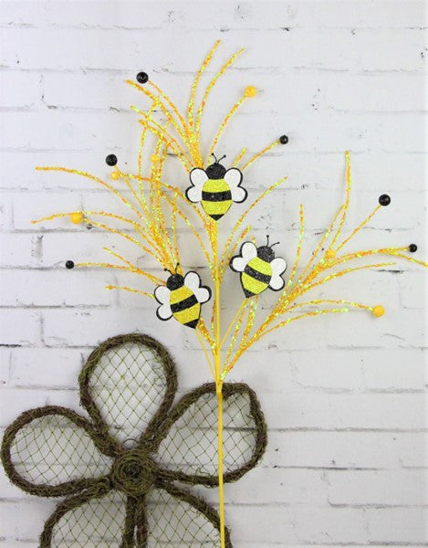My my, look what came out of the hive! This decorative glitter bumble bee/twig spray is an ideal accent piece for a decorative wreath! Featuring three glittery bumble bees attached to yellow twigs, with black and yellow glitter balls, this spray will be a show-stopper in any adaptation! This spray will surely fit well in a vine wreath, complete with ribbon, mesh and other fun sprays!