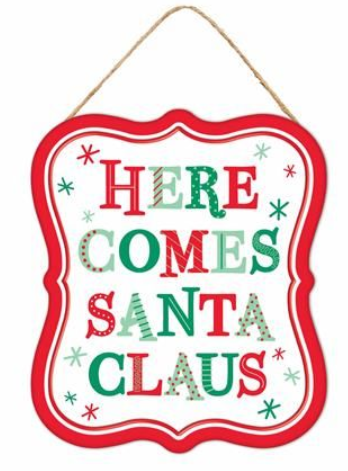 7"Hx6"L Tin Matte Santa Sign - Here Comes Santa Claus