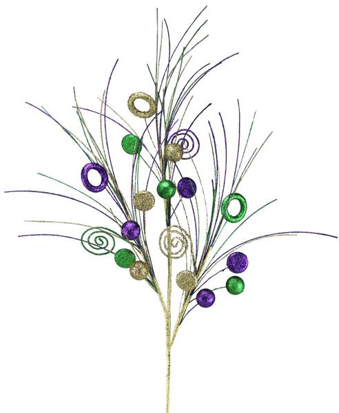 Use this eccentric glitter ball/circle/disc spray to enhance your most creative Mardi Gras display! This spray features strands of purple, emerald green and gold in twisty coil shapes, along with glittery balls, discs and grasses to top it all off! Add this spray to a wreath, outfitted with ribbon and mesh, or use it in a hanging planter outfitted with complementary enhancements!